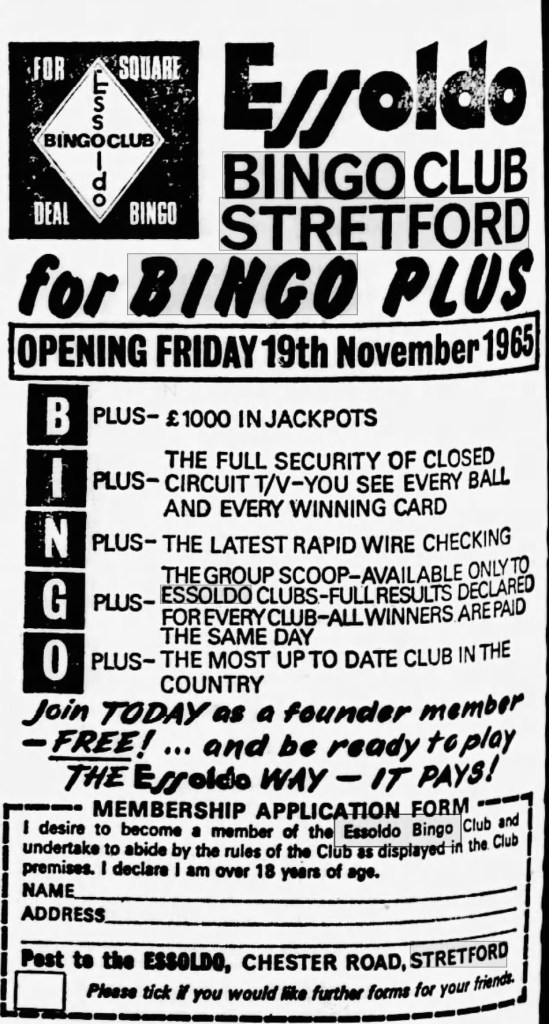 The Essoldo plays its last film on 3rd October 1965 and is then converted into Essoldo Bingo, opening in Stretford on Friday 19th November 1965 – members only, apply here!